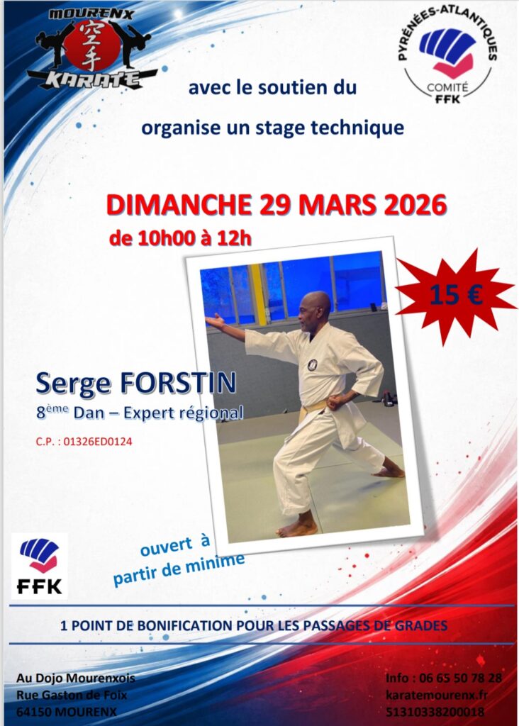Notre club organise, avec le soutien du Comité Départemental, un stage technique animé par Serge FORSTIN (Expert régional 8ème Dan) le Dimanche 29 Mars 2026 de 10h00 à 12h00 au Dojo de Mourenx.